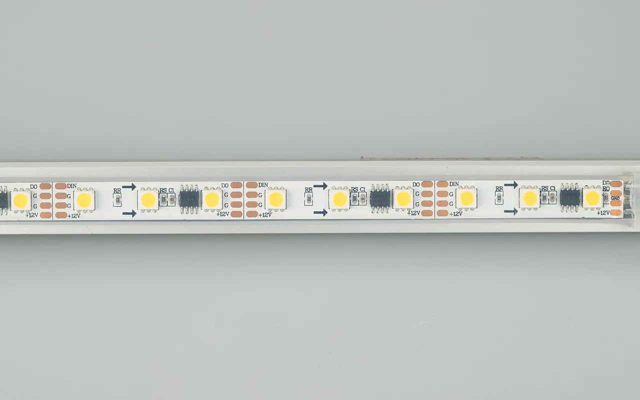 Гибкая герметичная БЕЛАЯ лента Бегущие огни в силиконовой трубке (IP66), со СКОТЧЕМ 3M на обратной стороне, с драйвером 1804, встроенный в ленту контроллер с циклическим автозапуском 17 программ (Auto mode) и подкл-ем внеш. контроллера. Длина 5м, 300шт LED WarmWhite 5060, 20 pixel/m (1 pixel = 3 LED). Питание 12V, ном. мощн. 10 Вт/м (динамич. режим), макс. мощн-ть 13,2 Вт/м (статический белый цвет). Ширина 12 мм. Герметичные КРУГЛЫЕ коннекторы.