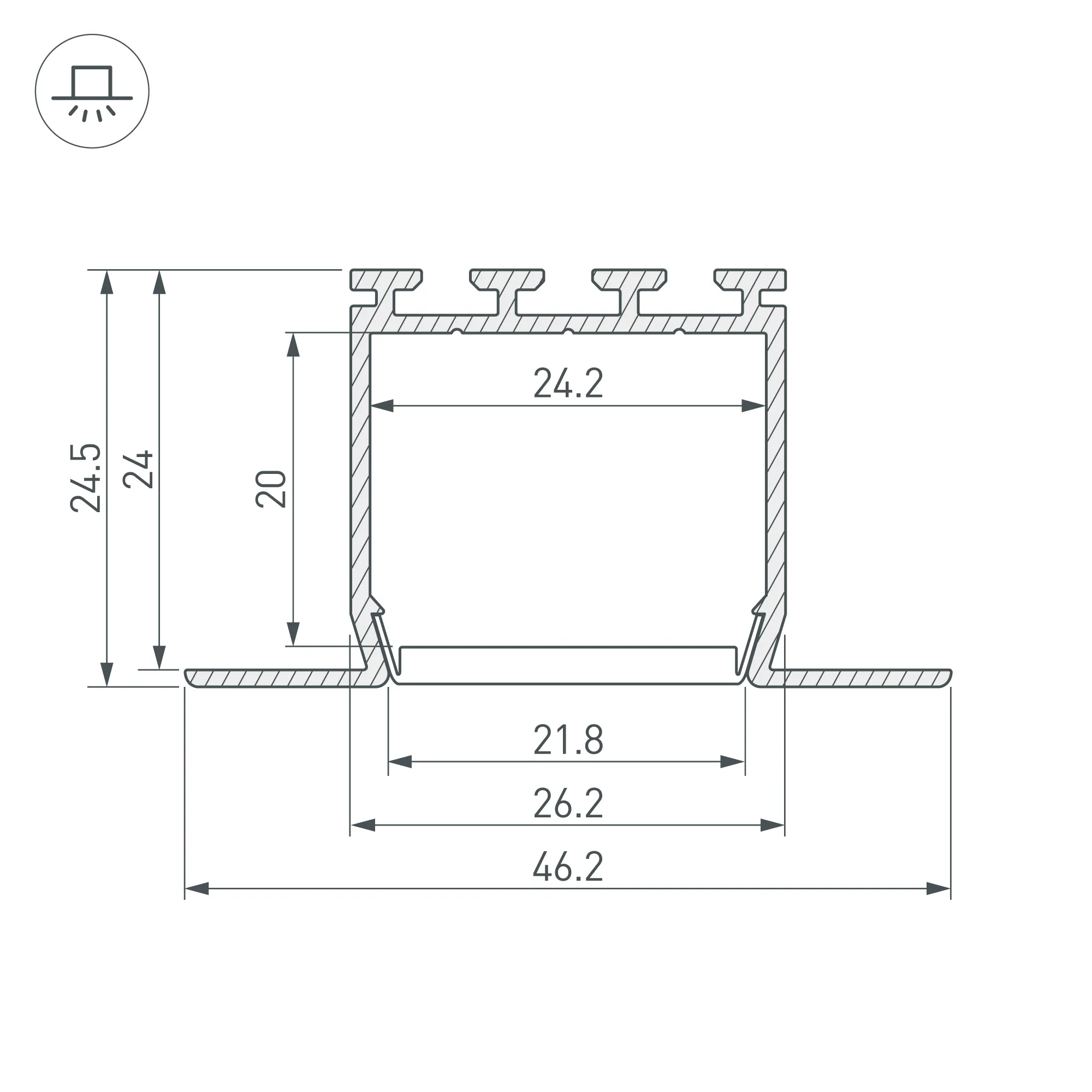 Алюминиевый встраиваемый профиль для светодиодных лент и линеек. Цвет - белый RAL9010 (порошковая окраска). Габаритные размеры (L×W×H): 2000x46.2x24.5 мм. Ширина площадки для ленты 24,2 мм. Экраны, заглушки и другие аксессуары приобретаются отдельно. Цена за 1 метр.