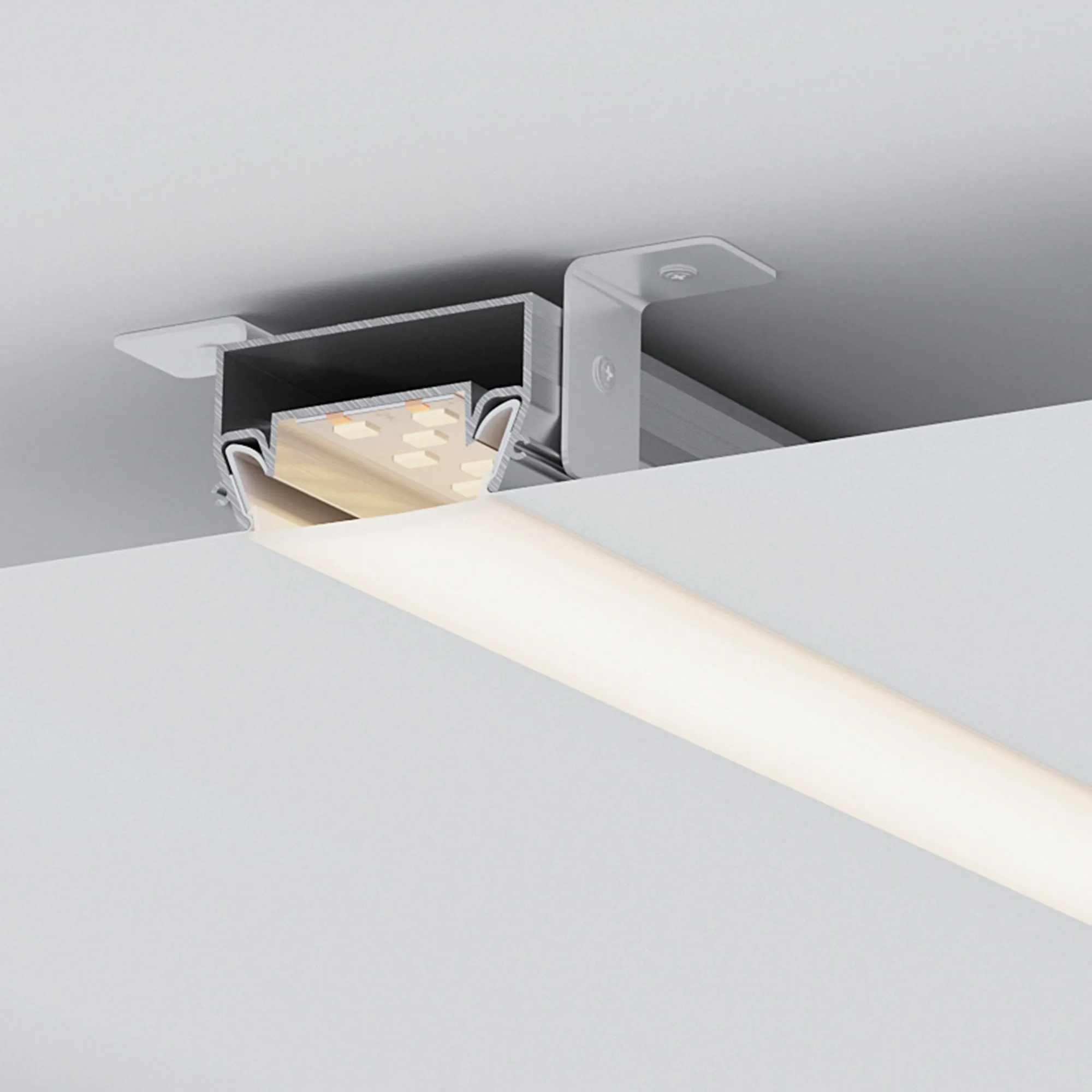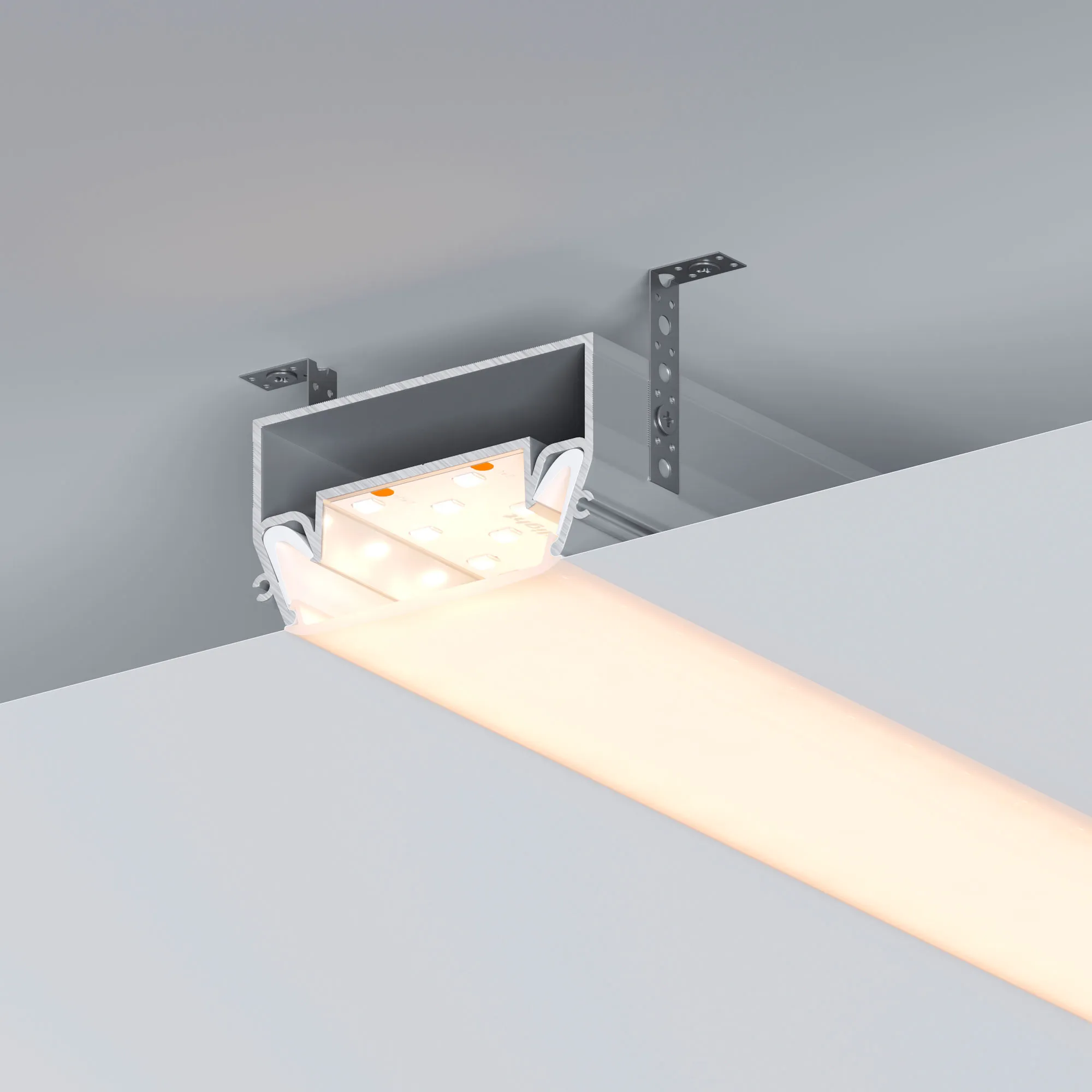 Алюминиевый профиль для натяжных потолков (центральная линия). Решение 2-в-1 - каркас для крепления натяжного потолка и профиль для установки светодиодной ленты. Для дизайнерских решений «линии света» в натяжных потолках. Монтируется к потолку накладным способом. Ширина площадки для ленты 36,2 мм. Длина 2000 мм. Цена за 1 м.