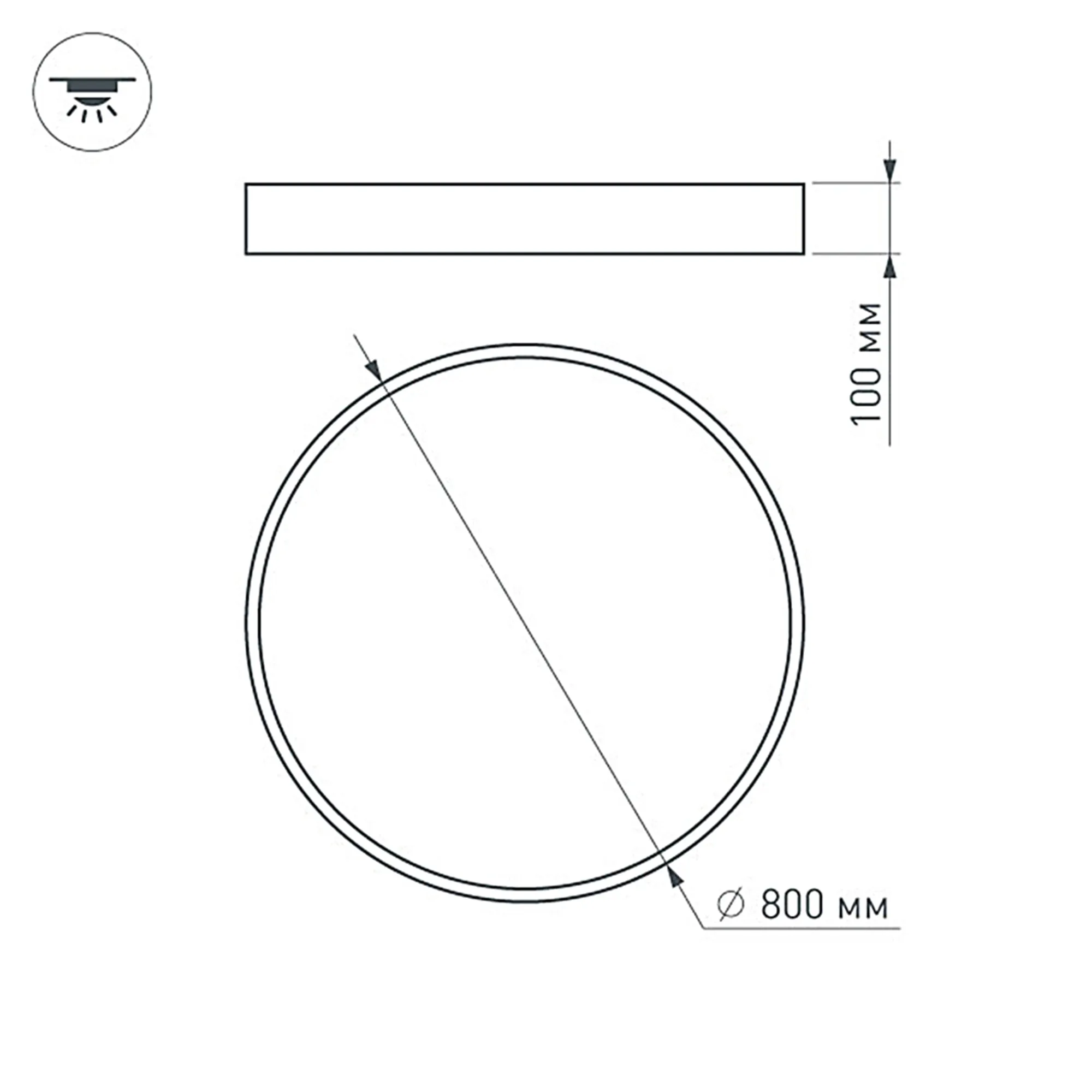 Накладной интерьерный светильник. Мощность 94 Вт, св. поток 7620 лм, 80 лм/Вт, теплый 3000 K, CRI>80, угол 100°, напряжение питания 230 В. Белый круглый корпус из алюминия, степень защиты IP20. Призматический акриловый рассеиватель. Размер: диаметр 800 мм, высота 100 мм. Монтаж накладной. Драйвер 28-42 В, 1200 мА (2 шт.), пульсация <2%.