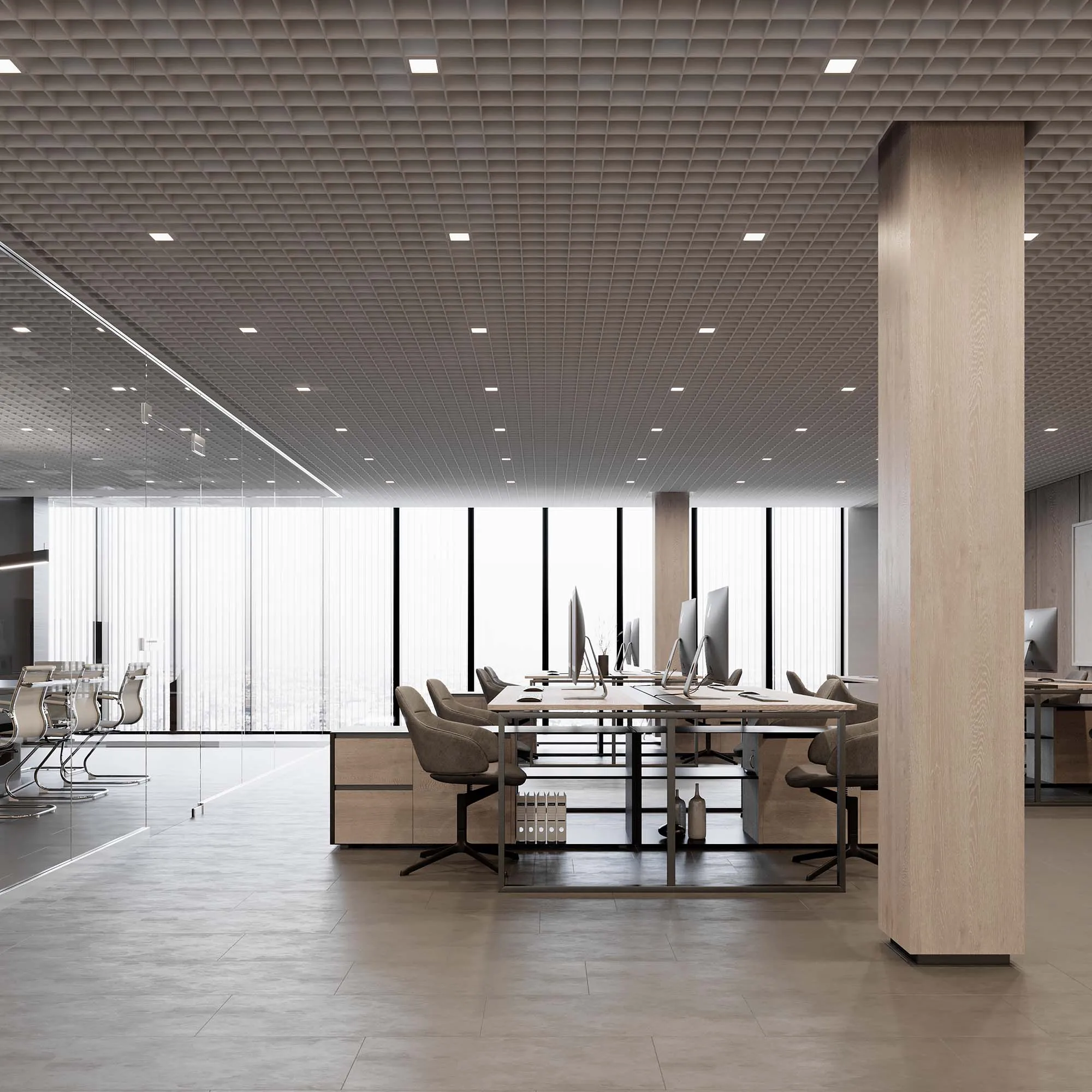 Встраиваемый светильник даунлайт для установки в потолки Грильято с размером ячейки 100х100 мм и высотой направляющих 30, 40 или 50 мм. Мощность 12 Вт, св. поток 1154 лм, 98 лм/Вт, тёплый 3000 K, CRI>90, угол 90°, напряжение питания 230 В. Серый квадратный корпус из алюминия (RAL 7045), степень защиты IP40. Размер: длина 90 мм, ширина 90 мм, высота 40 мм. Монтаж встраиваемый, установочное отверстие: длина 90 мм, ширина 90 мм. Драйвер 24-42 В, 300 мА, пульсация <2%.