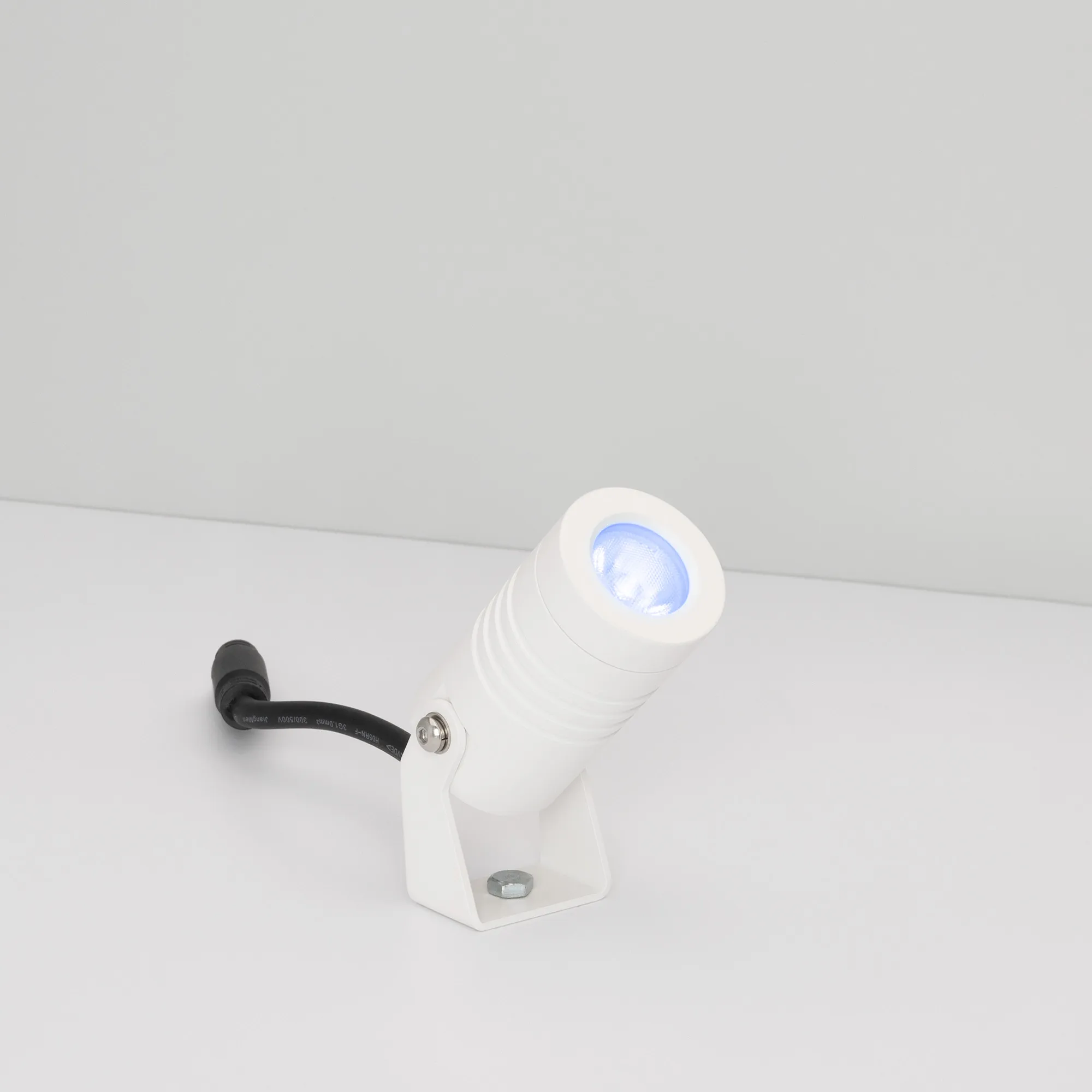 Уличный светодиодный прожектор, мощность 6Вт, угол освещения 25°. Цвет свечения RGB, световой поток 200лм. Влагозащищенный корпус IP67 - белый алюминий, экран из закаленного стекла. Угол поворота корпуса в вертикальной плоскости 135°. Питание DC12В, мощность 6Вт. Размеры DxH - Ø42x75мм. В комплекте 1м провод.