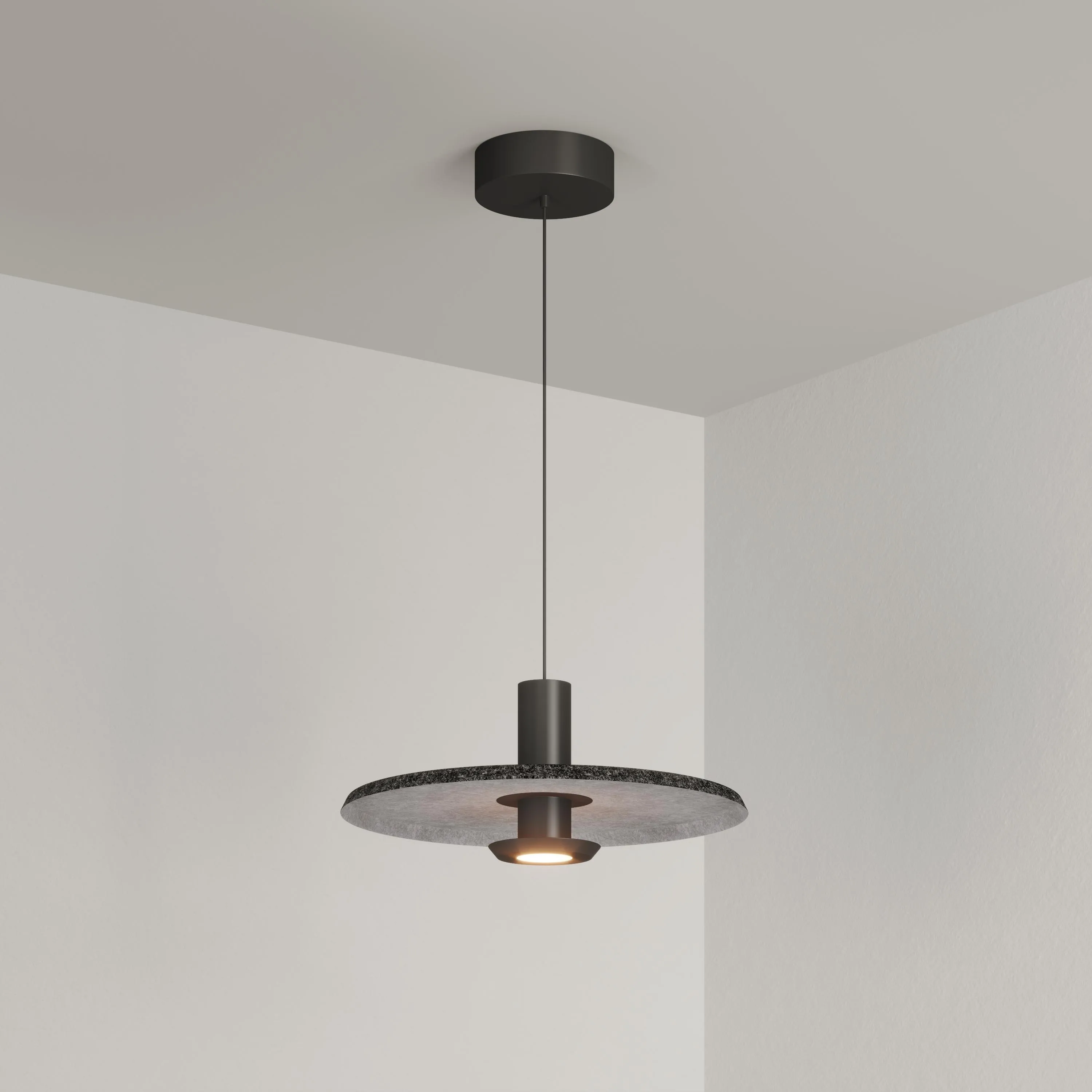 Подвесной светильник. Мощность 12 Вт, св. поток 708 лм, 59 лм/Вт, теплый 3000 K, CRI>94, угол 36°, напряжение питания 230 В. Темно-серый фигурный корпус из переработанного фетра с светло-серой внутренней поверхностью, линза-рассеиватель из PMMA, степень защиты IP20. Размер: диаметр 350 мм, высота 145 мм. Монтаж подвесной, длина подвеса 2000 мм, регулируемая. В комплекте 2 вида чаш. Габариты чаши (встраиваемая) Ø80 х 23 мм, врезное отверстие Ø60 мм. Габариты чаши (накладная) Ø120 x 35 мм. Драйвер 59 В, 300 мА, пульсация <1%. Управление по TRIAC.