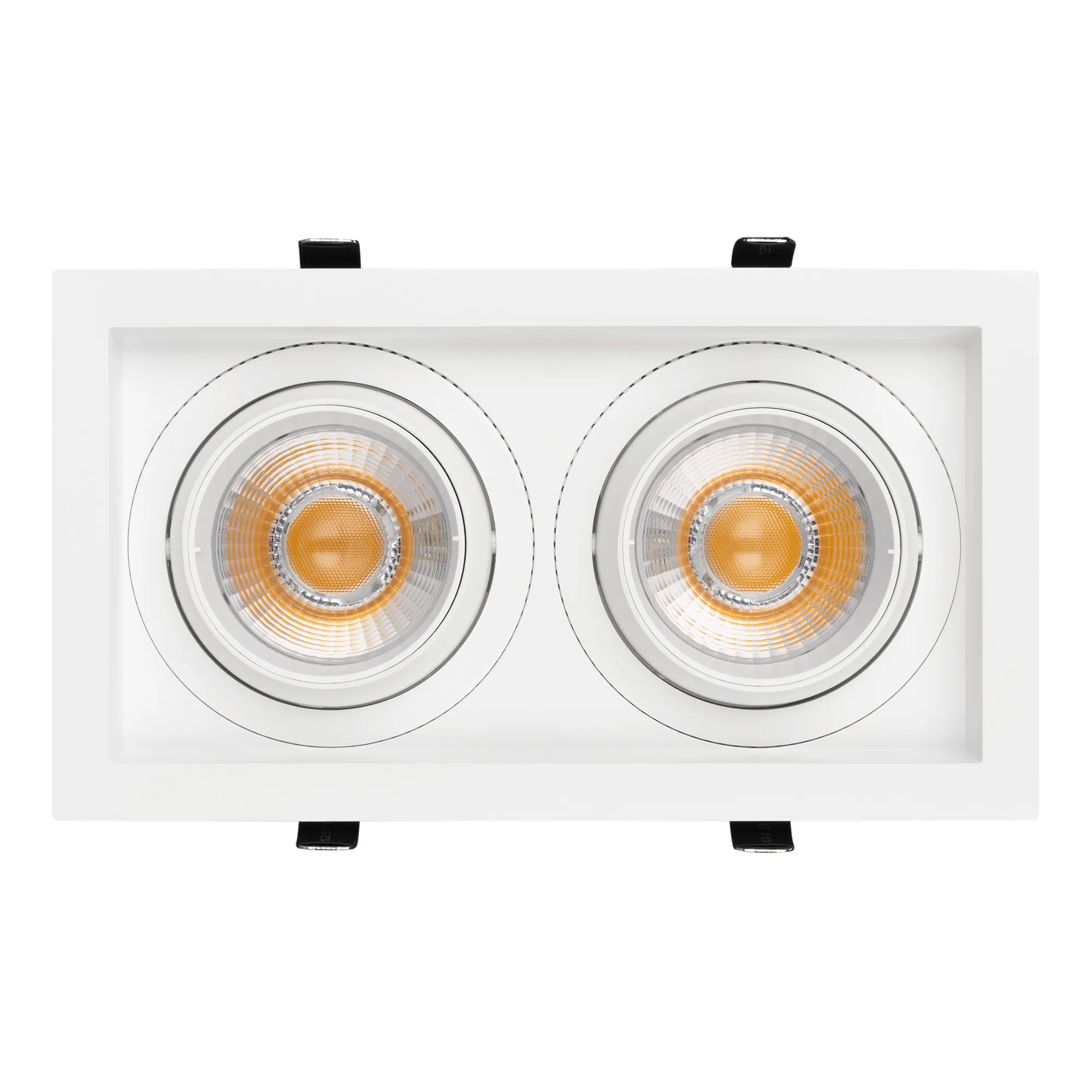 Встраиваемый карданный светильник. Мощность 2х30 Вт, св. поток 6520 лм, 108 лм/Вт, дневной 4000 K, CRI>92, угол 30°, напряжение питания 230 В. Белый корпус из алюминия, степень защиты IP20. Размер: длина 250 мм, ширина 140 мм, высота 125 мм. Монтаж встраиваемый, установочное отверстие: длина 230 мм, ширина 120 мм. Драйвер 24-42 В, 750 мА, пульсация <2%.
