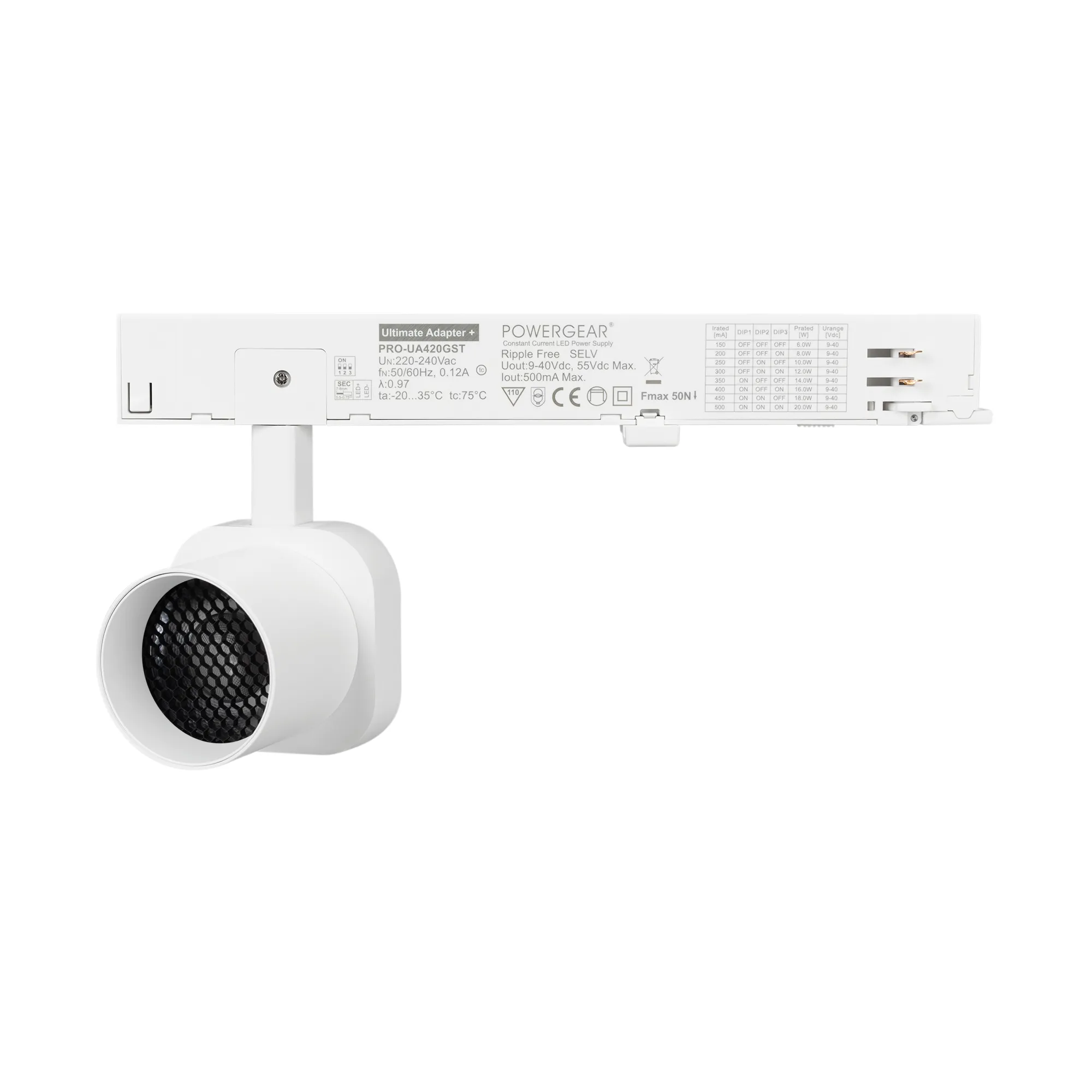 Светильник для треков/шин 4 провода. Мощность 10 Вт, св. поток 740 лм, 74 лм/Вт, дневной 4000 K, CRI>95, угол 60°, напряжение питания 230 В. Решетка HONEYCOMB в комплекте. Белый квадратный корпус из алюминия, материал линзы PC поликарбонат, степень защиты IP20. Размер световой части 60х60х62 мм. Монтаж на трек 3-фазный. Драйвер встроенный 9-40 В, 250мА., пульсация <1%